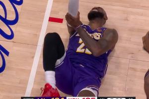GIF-燃尽了!詹姆斯先连续防守又全力冲刺上篮被犯规 手肘再次受伤!