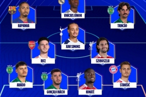 欧冠周最佳阵:拉菲尼亚、维尼修斯、赖斯、索博、科纳特入选