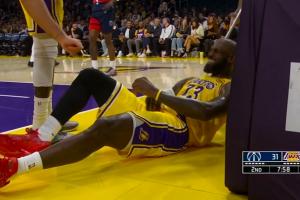 GIF-詹姆斯上篮倒地 和裁判说几句 抱怨被打手了